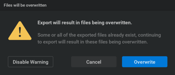 Export Warning On Overwrite: If checked, a warning will pop up when trying to export something that would overwrite something else. for example, if you try to export a flipbook with the same name, extention, and target directory as an already existing flipbook. Disable Warning will uncheck this parameter, Cancel will cancel the export so that no files will be overwritten, and Overwrite will continue the export overwriting the files.