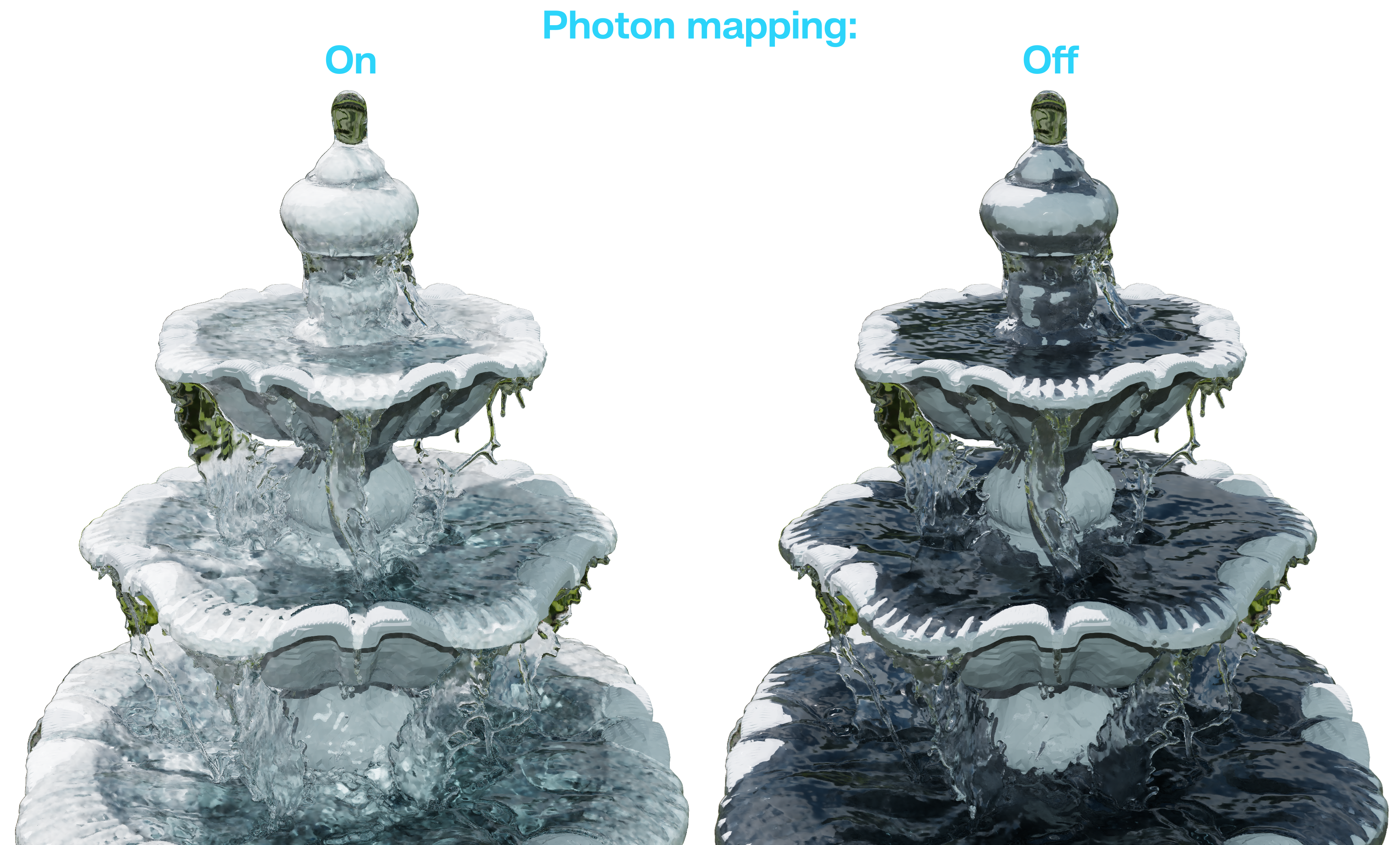 Photon mapping: If checked, the photon mapping algorithm will be applied. Photon mapping simulates caustic light (light concentrated by reflection/refraction) resulting in more realistic renders.