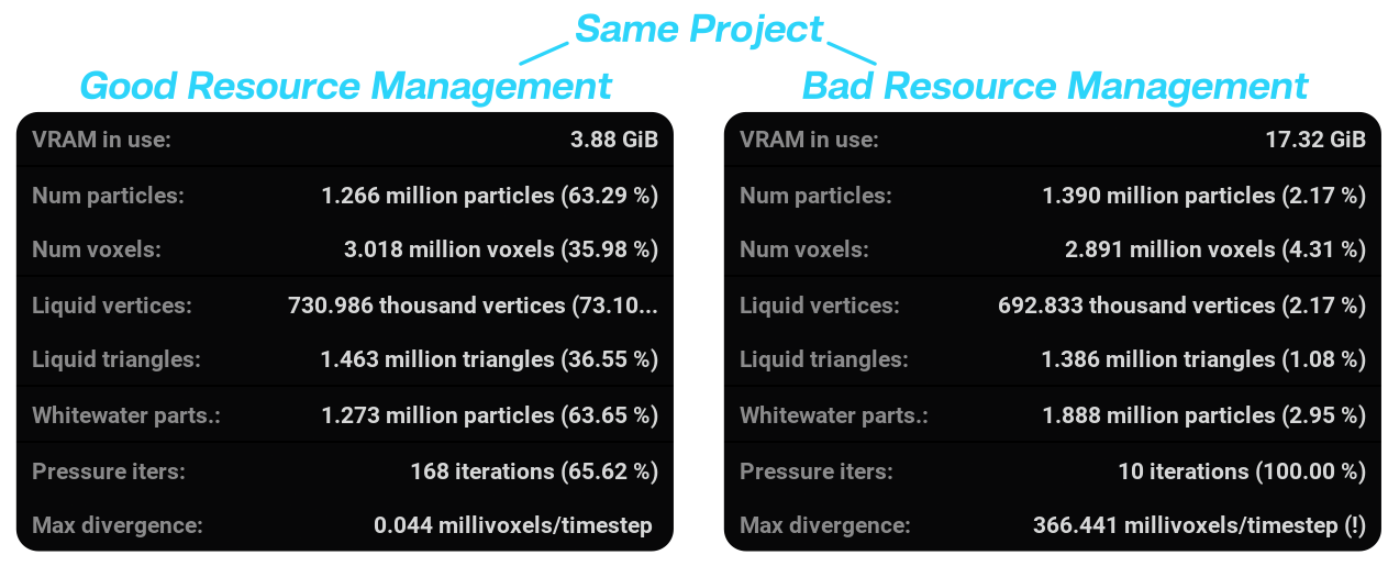 When managing resources, try getting the maximum values close to the actual maximum values of your simulation. This way, you will make sure the simulation is the fastest it can be. You can see how many percent of your resources are used in the Stats in the viewport. The Stats window can be opened by selecting Stats from the View menu or pressing Shift + S