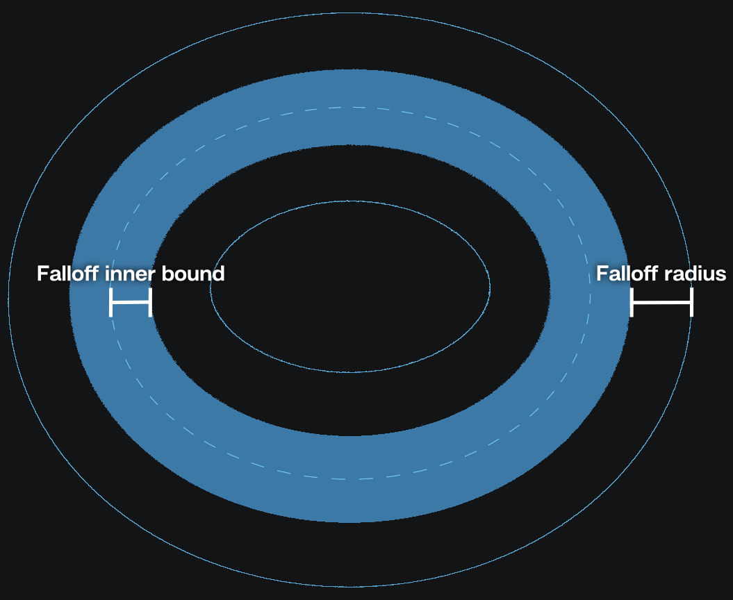 Mask falloff distance: Maximum distance where falloff is applied, starting at the mask surface and extending outwards to this value, falloff isn’t applied inside the mask.